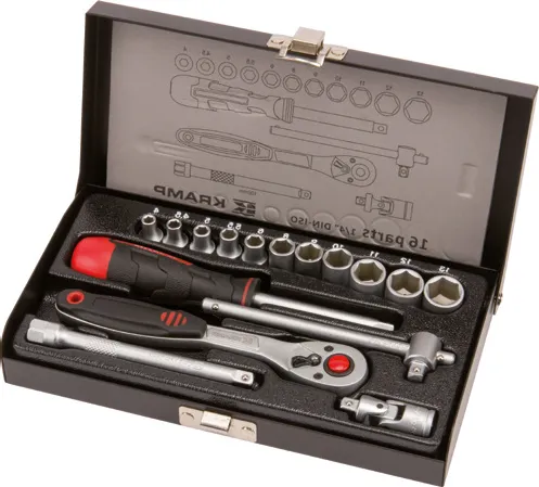 Ammattikäyttöön soveltuva 16-osainen hylsysarja, joka sisältää hienohampaisen räikkäavaimen ja erilaisia kromivanadiumteräksestä valmistettuja hylsyjä, 1/4" vääntiö. Selkeästi jaotellussa, lujassa ja kestävässä metallikotelossa.